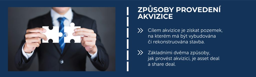 Dokument přehledně shrnuje rozdíly mezi asset dealem a share dealem, upozorňuje na klíčové daňové souvislosti a provází jednotlivými fázemi akvizičního procesu. Slouží jako praktická pomůcka pro developery i investory, kteří se chtějí včas připravit na to, co akvizice obnáší – a jaká rozhodnutí je vhodné učinit ještě před zahájením samotné transakce.